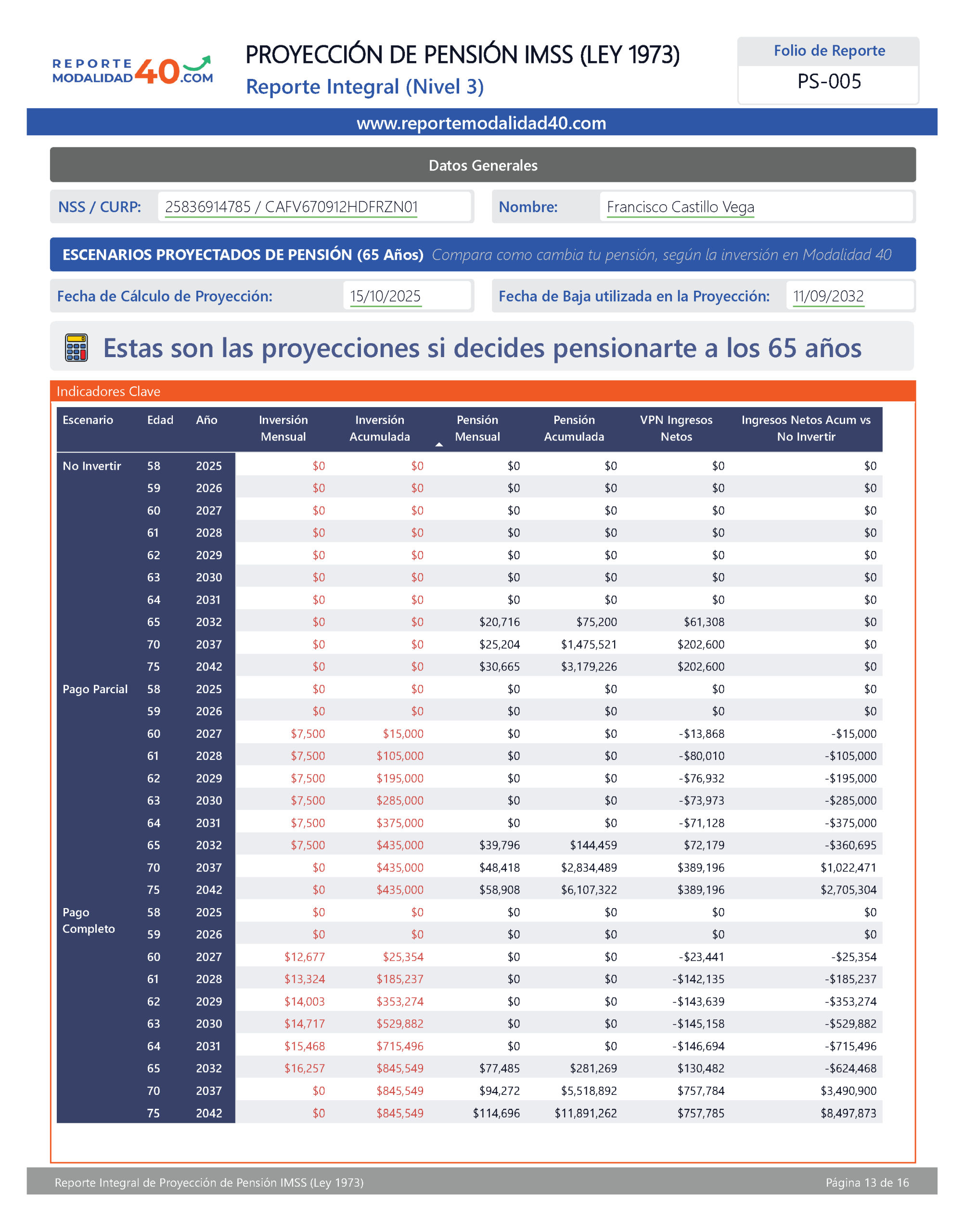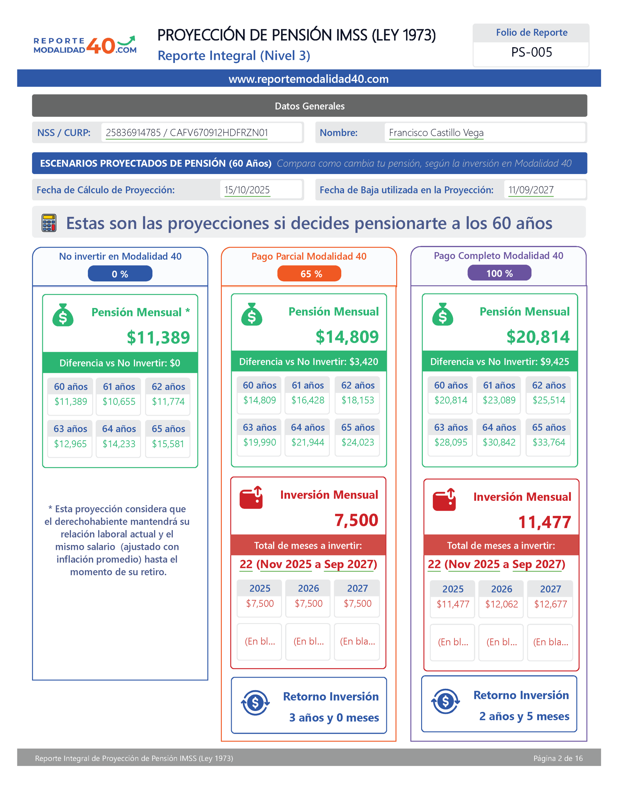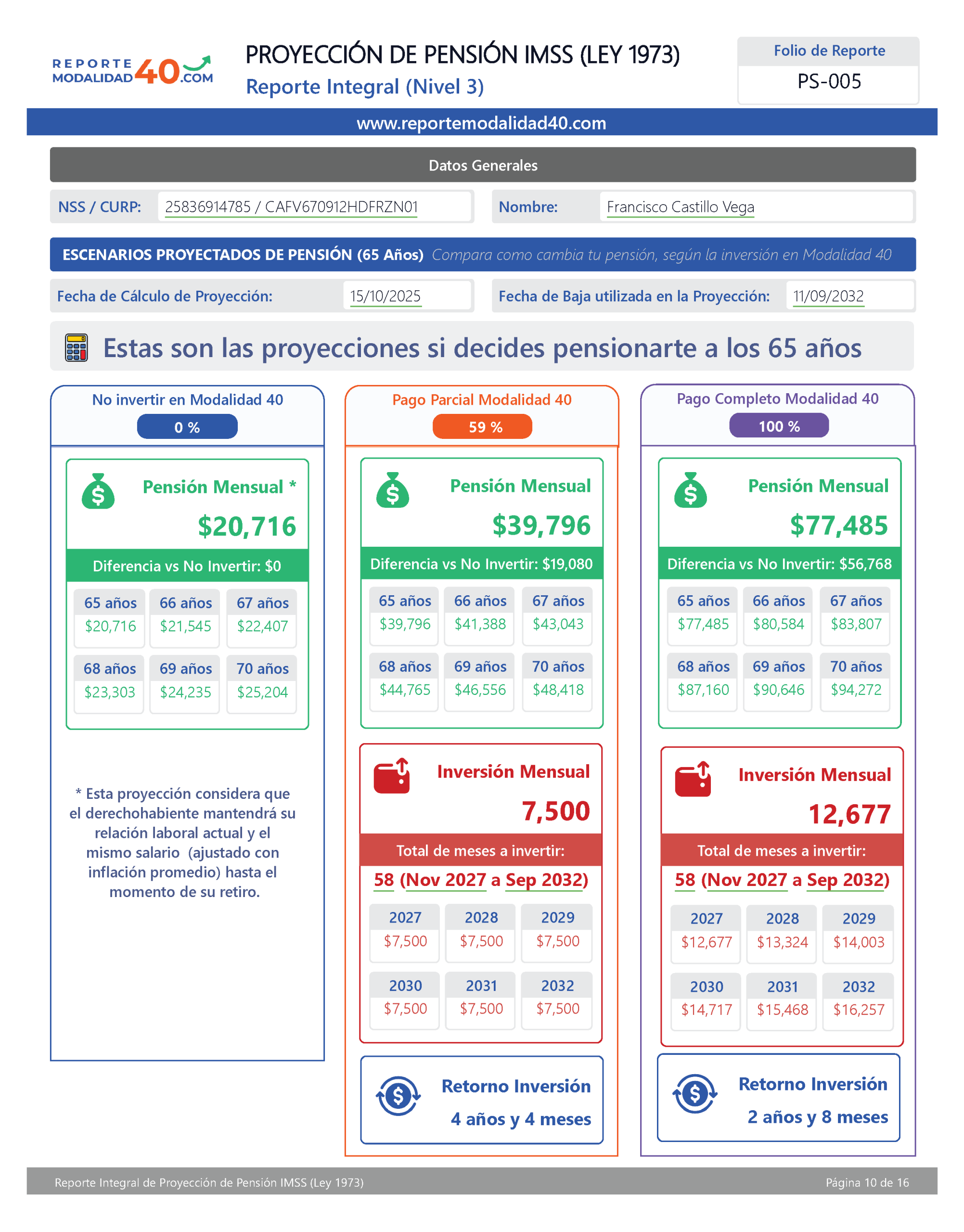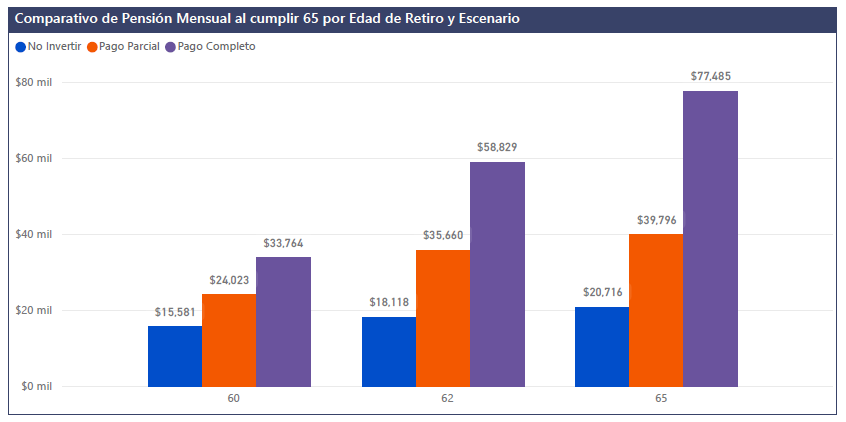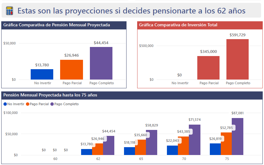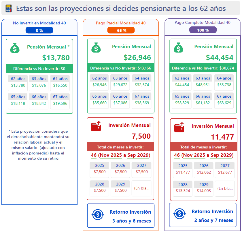 El Reporte Integral es el análisis más completo para evaluar tu pensión con Modalidad 40. Incluye proyecciones financieras avanzadas, retorno de inversión, comparativos por edad de retiro, ingreso neto acumulado y VPN, para que elijas con certeza la estrategia que más te conviene. Ideal para quienes quieren tomar una decisión totalmente informada y basada en números.