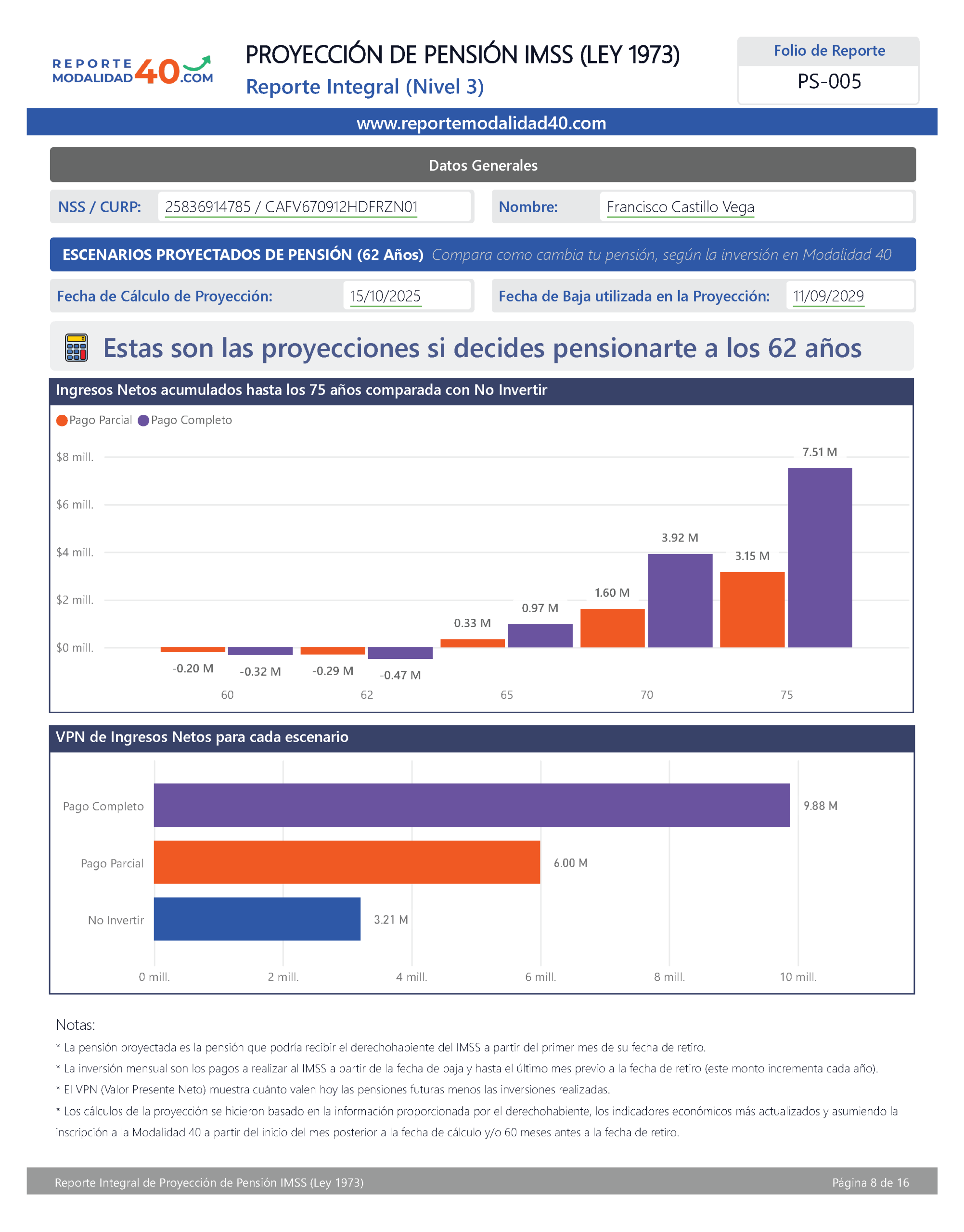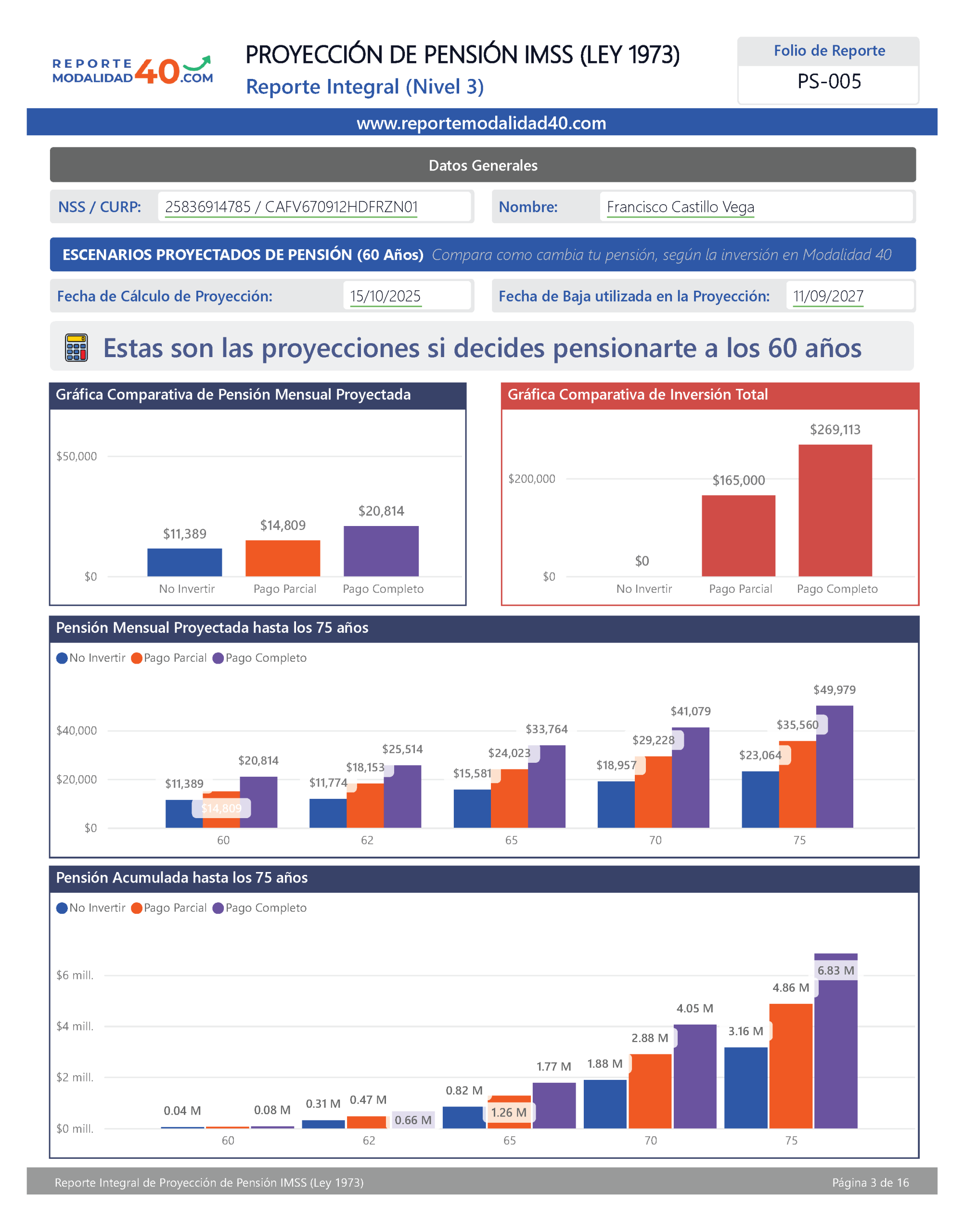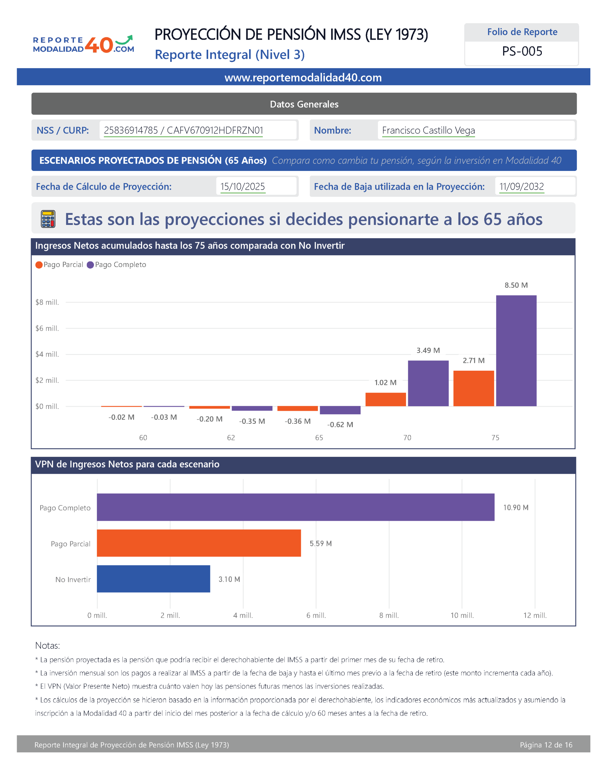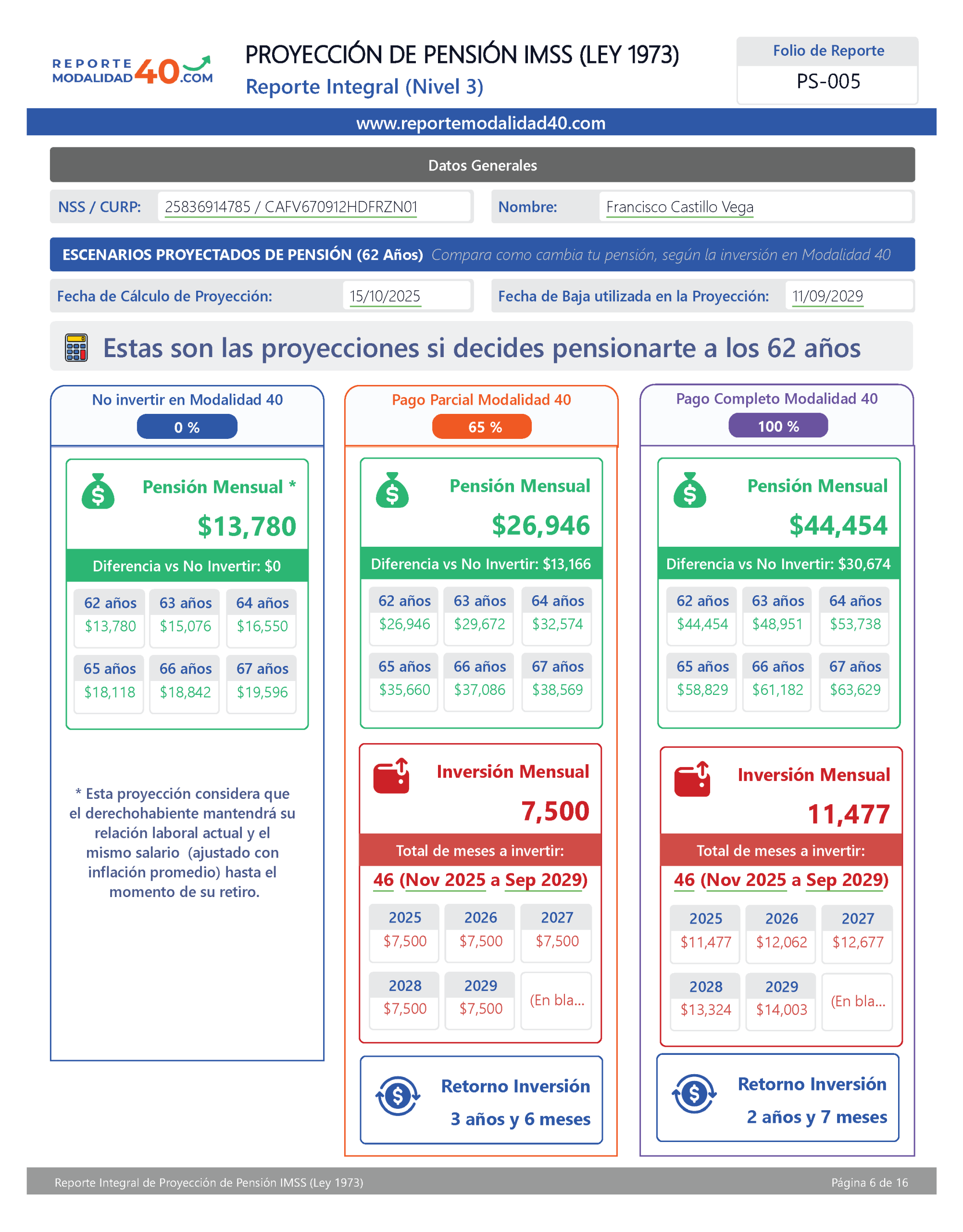 El Reporte Integral es el análisis más completo para evaluar tu pensión con Modalidad 40. Incluye proyecciones financieras avanzadas, retorno de inversión, comparativos por edad de retiro, ingreso neto acumulado y VPN, para que elijas con certeza la estrategia que más te conviene. Ideal para quienes quieren tomar una decisión totalmente informada y basada en números.